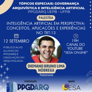 O Programa de Pós-Graduação em Gestão de Documentos e Governança Arquivística (PPGDARQ/UEPB–UFPB) realiza, no próximo dia 12 de setembro, às 19h, a palestra “Inteligência Artificial em Perspectiva: Conceitos, Aplicações e Experiências no TRT -13”, ministrada por Diemano Bruno Lima Nóbrega, técnico judiciário do TRT da 13ª Região (PB).