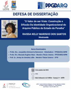 O Programa de Pós-Graduação em Gestão de Documentos e Governança Arquivística (PPGDARQ – UEPB/UFPB), convida a comunidade acadêmica e o público em geral para a defesa pública da dissertação da mestranda Raissa Kelly Marinho dos Santos, intitulada: “O Valor de ser Visto: Construção e Difusão da Identidade Organizacional do Arquivo Público do Estado da Paraíba”.