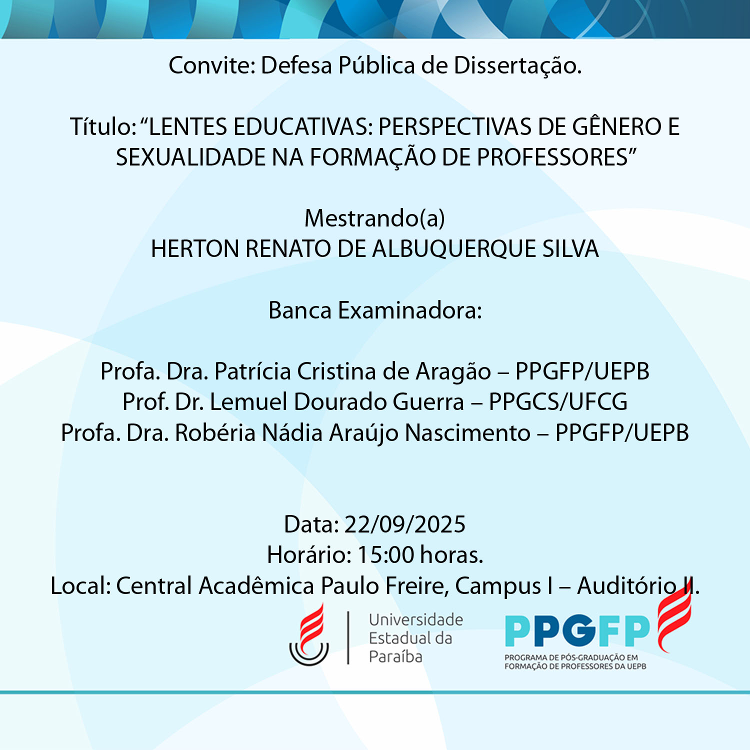 A Coordenação do Programa de Pós-Graduação em Formação de Professores – PPGFP torna público a Defesa de Dissertação do(a) Mestrando(a): Herton Renato de Albuquerque Silva.