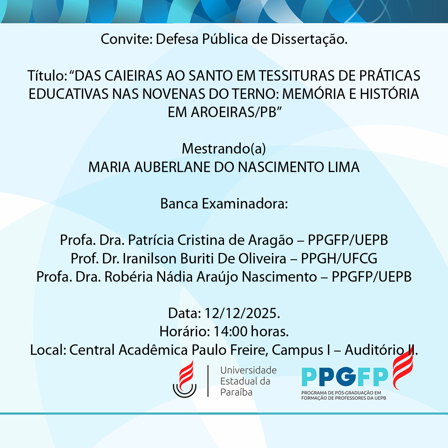 UEPB /PPGFP / Eventos / Notícias Destaque / A Coordenação do Programa de Pós-Graduação em Formação de Professores – PPGFP torna público a Defesa de Dissertação do(a) Mestrando(a): Maria Auberlane do Nascimento Lima.