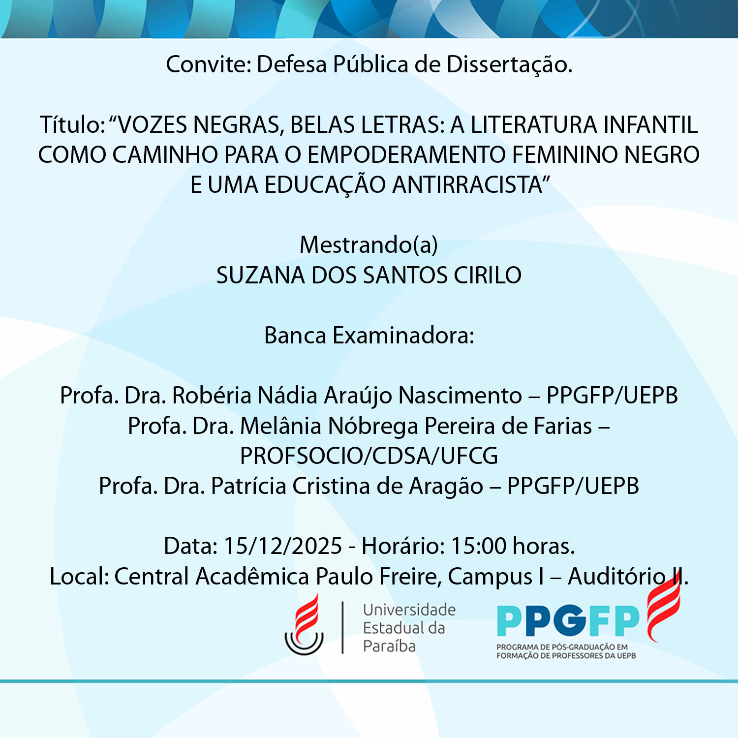 UEPB /PPGFP / Eventos / Notícias Destaque / A Coordenação do Programa de Pós-Graduação em Formação de Professores – PPGFP torna público a Defesa de Dissertação do(a) Mestrando(a): Suzana dos Santos Cirilo.
